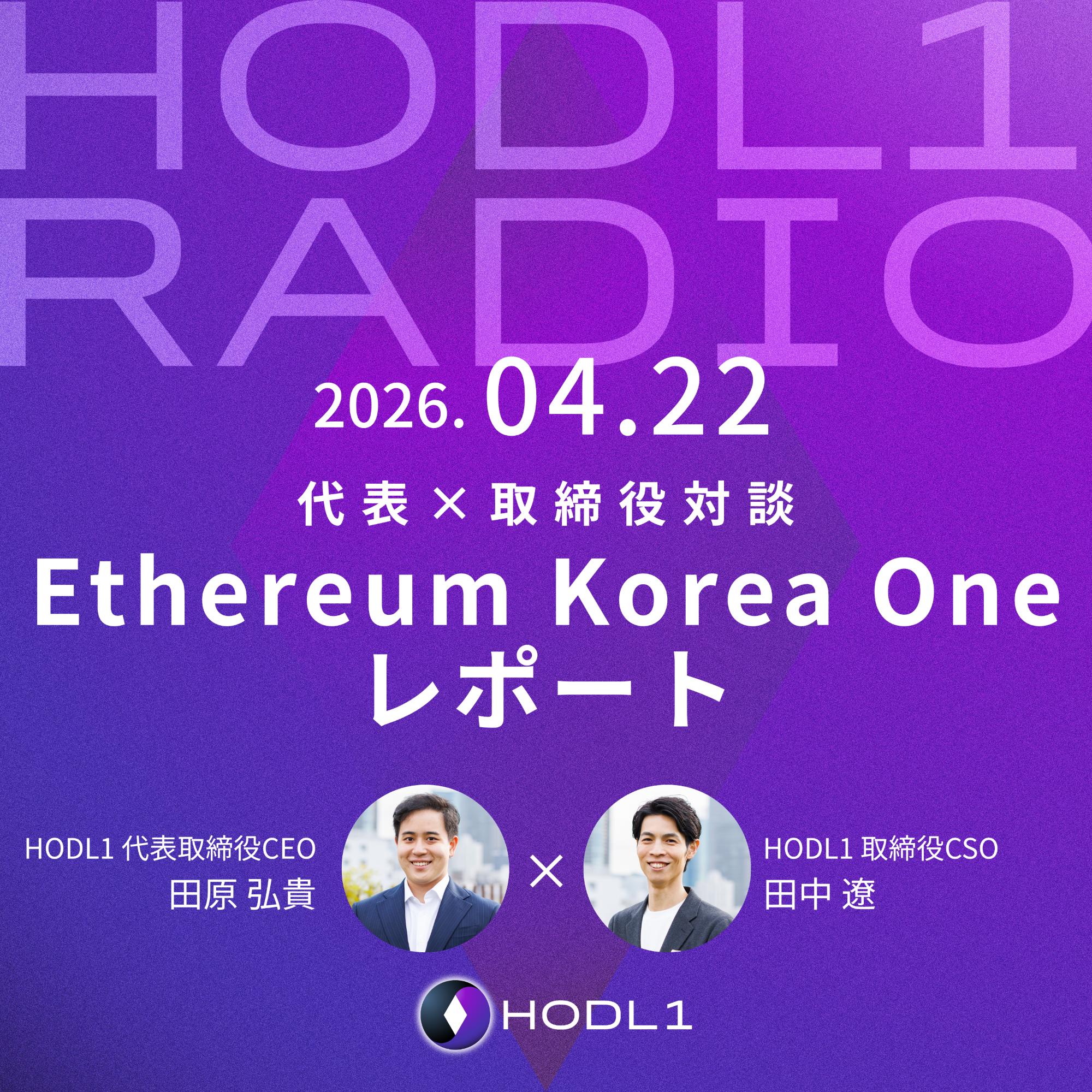 News 2026.04.22 4月22日(水)「HODL1ラジオ」配信のお知らせ 4月22日(水)19時より「HODL1ラジオ」を配信開始いたしましたのでお知らせします。 HODL1ラジオ「Ethereum Korea Oneレポート」 登壇者:田中 遼(HODL1 取締役CSO)/大島 卓也(HODL1 取締役COO)配信URLはこちら質問・ご意見フォームはこちら Back